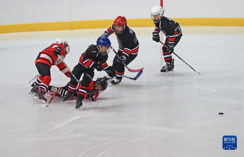 1月5日,青少年球員在開幕式上進(jìn)行冰球表演賽。