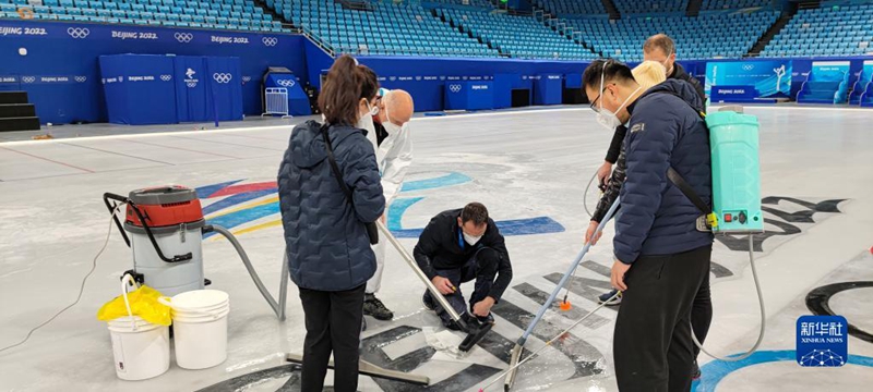 1月11日,首都體育館外籍制冰專家雷米·博勒(中)在進(jìn)行冰面制作。