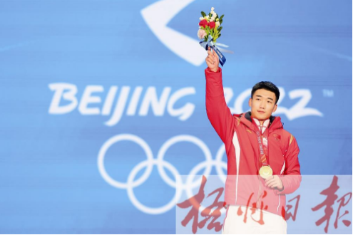 2月12日下午,中國冬奧代表團旗手、平昌冬奧會季軍高亭宇如一道紅黑色閃電沖過終點,痛快淋漓贏得北京冬奧會速度滑冰男子500米“飛人大戰”,斬獲中國男子速度滑冰冬奧會首金。