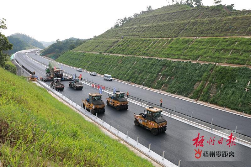 8月13日,蒼梧至容縣高速公路(蒼容高速)藤縣段建設(shè)現(xiàn)場(chǎng)機(jī)聲隆隆,建設(shè)者正在鋪設(shè)瀝青。