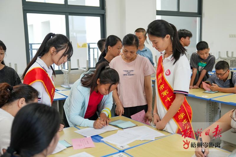 8月28日,在市第十七中學,學生志愿者協助初一新生和家長填寫注冊資料。梧州日報記者 李燦明 攝