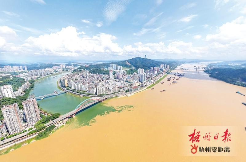 10月13日,在航拍鏡頭下,清澈碧綠的桂江與泛黃雄渾的潯江交匯。涇渭分明的雙色水流相互碰撞融合,周邊林立的高樓與遠(yuǎn)處的青山相映成趣,展現(xiàn)出梧州獨(dú)特的城市風(fēng)貌與蓬勃生機(jī)(無(wú)人機(jī)照片)。梧州日?qǐng)?bào)記者 李燦明 攝