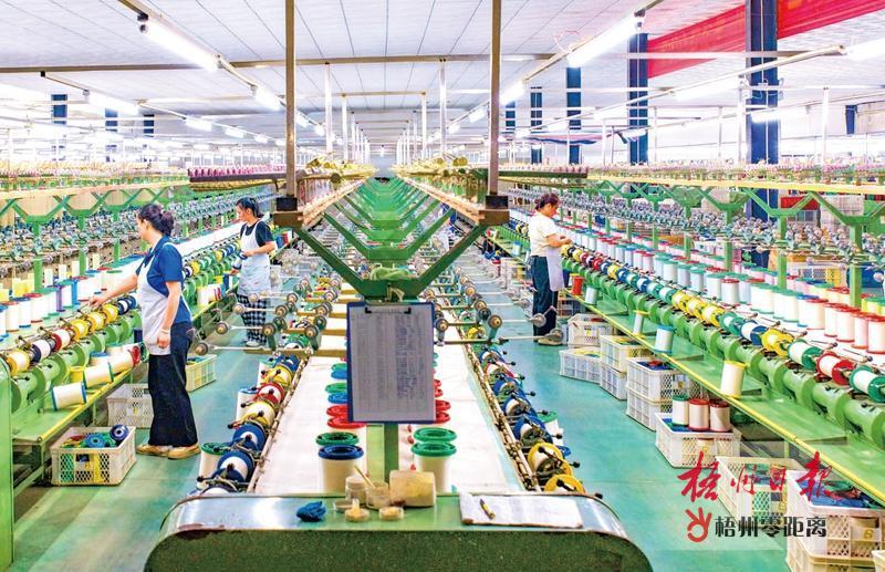 近日,蒙山縣絲綢工業園區五豐絲綢有限公司織綢車間工人正在車間內工作。