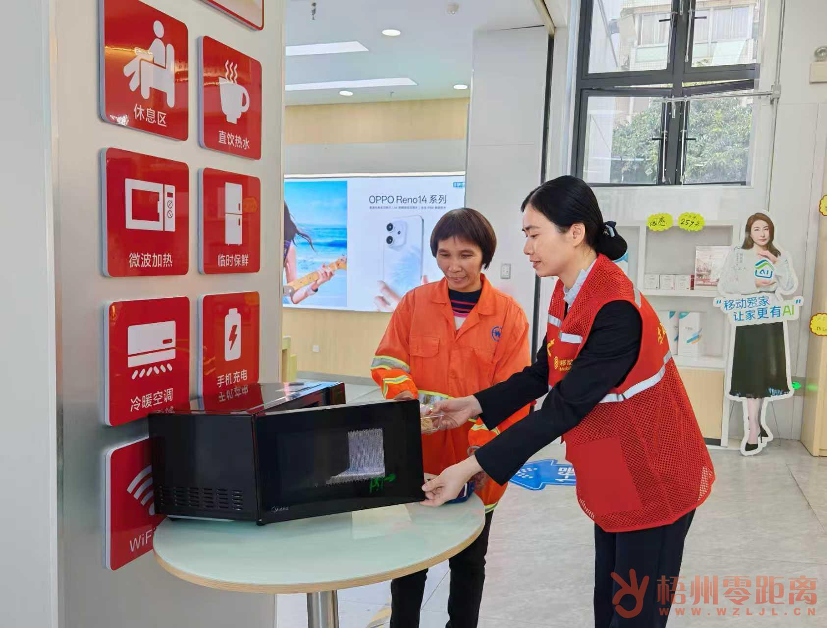 10月24日上午,一名環衛工人提著還沒吃完的早餐走進中國移動新興三路營業廳。原來,忙碌了一早的她發現早餐變涼了,想起營業廳工會驛站常為戶外勞動者提供便利,便抱著試一試的心態前來求助。營業廳工作人員李妍立刻熱情上前接過環衛工人手上的早餐,熟練地放進微波爐。短短2分鐘后,李妍帶著熱氣的早餐從微波爐取出,笑著遞到她手中:“阿姨,小心燙,您慢慢吃。”環衛工人臉上露出了樸實的笑容,連連向李妍道謝。
