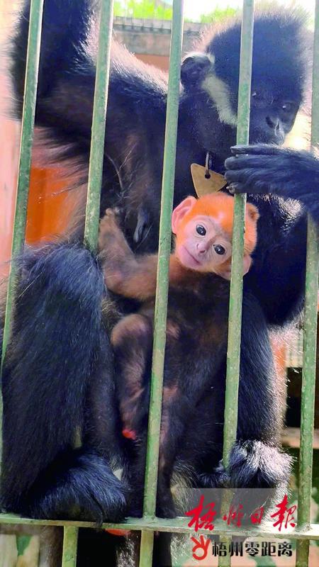 在市黑葉猴保護研究中心,新出生的猴幼崽毛發(fā)呈橙黃色,憨態(tài)可掬。記者 吳艷虹 攝
