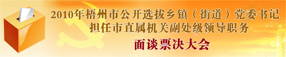 ?? 今天上午八時,在市委聯合辦公大樓舉行了2010年梧州市公開選拔鄉鎮(街道)黨委書記擔任市直屬機關副處級領導職務面談票決大會,由17名鄉鎮(街道)黨委書記進行公選職位入圍人員的面談。